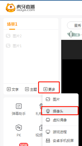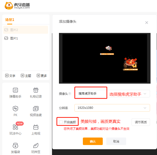 2、选择【搜库虎牙助手】摄像头,并勾掉美颜选项,如下图